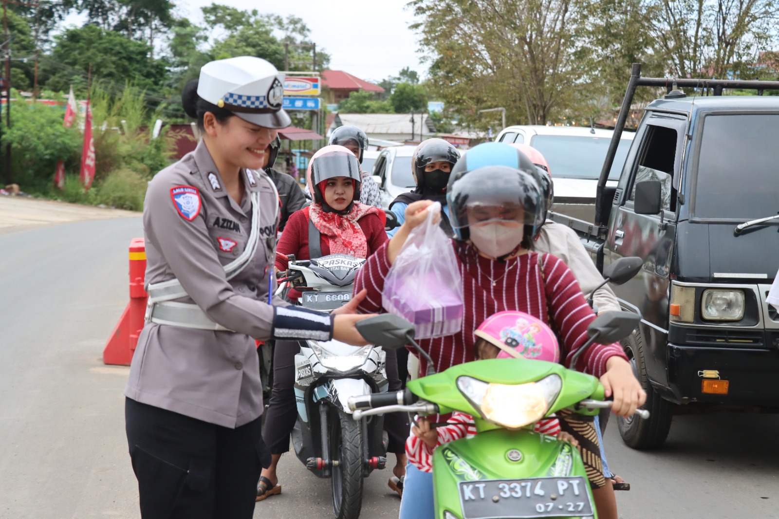 Satuan Lalu Lintas (Satlantas) Polres Kutai Barat turut serta berbagi kepada masyarakat dan pengendara kendaraan bermotor baik roda dua dan roda empat di Jalan-jalan protokol di Kecamatan Barong Tongkok Kabupaten Kutai Barat.